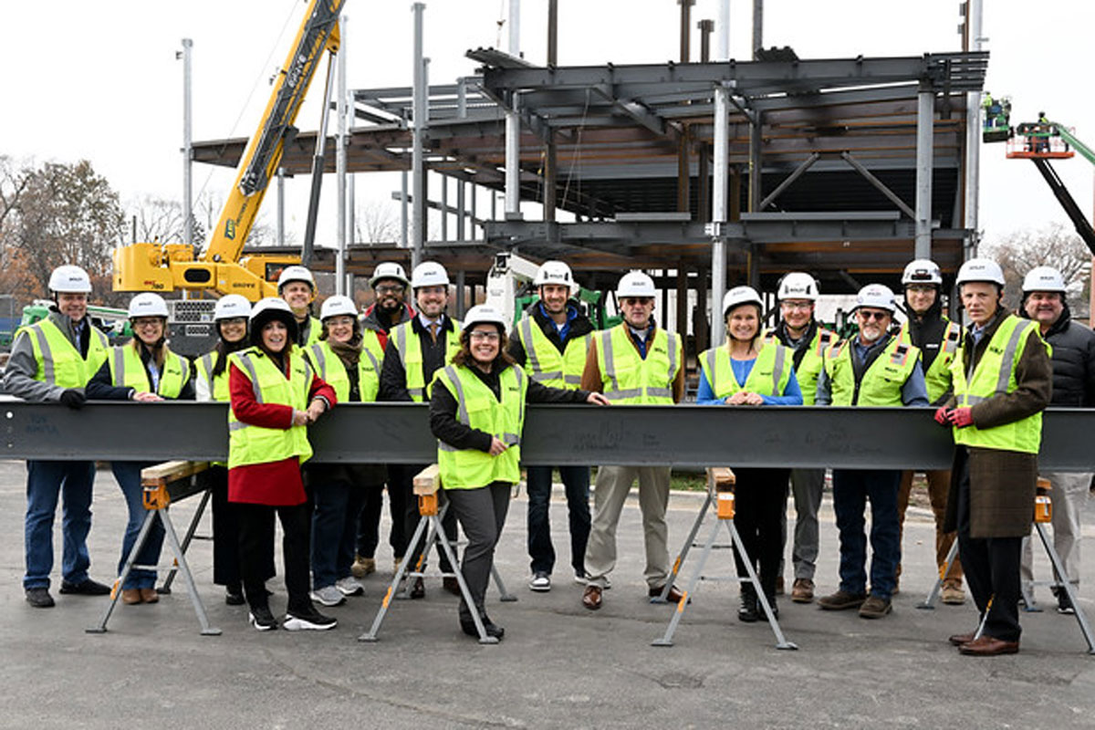 TOP PHOTO: Sen. Linda Holmes with Aurora University President Susana Rivera-Mills, construction-zone safe and weather ready to sign a steel construction beam for the new Aurora University Learning Commons