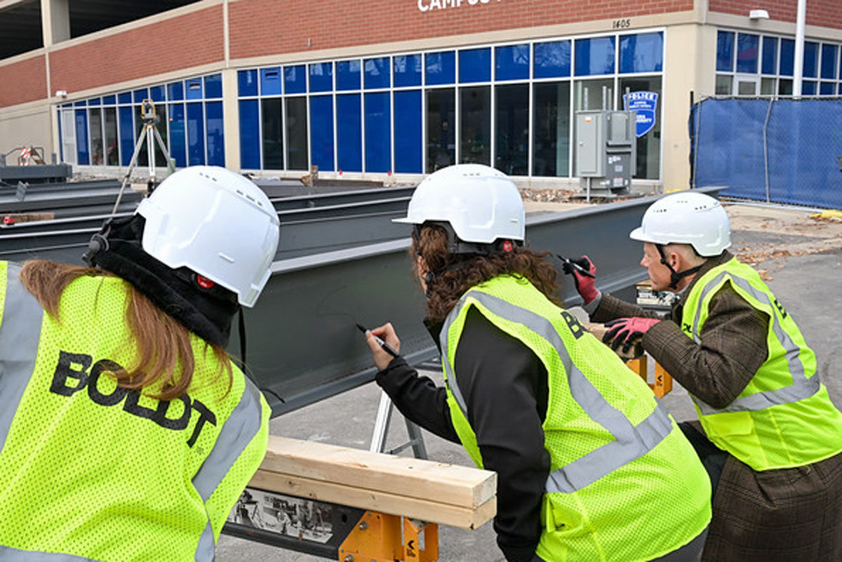 TOP PHOTO: Sen. Linda Holmes with Aurora University President Susana Rivera-Mills, construction-zone safe and weather ready to sign a steel construction beam for the new Aurora University Learning Commons